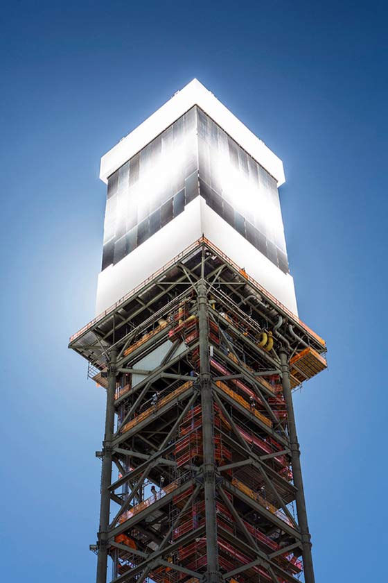 Вокруг трёх огромных 140 метровых башен расположено 300 тысяч зеркал, которые отражают солнечный свет на вершины башен, где в резервуарах вода превращается в пар, который вращает турбины, а те в свою очередь вырабатывают электроэнергию. Система зеркал управляется из командного центра и каждое зеркало может изменять направление и угол наклона.