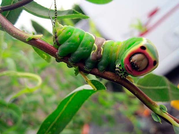 Своей яркой окраской эта гусеница предупреждает своих врагов об опасности. Пара черных отметин на ее спине призваны также играть роль фиктивных глаз для большего устрашения. В завершении следует упомянуть о двух жалах, выступающих из ее спины, которые заряжены неплохой порцией муравьиного яда.